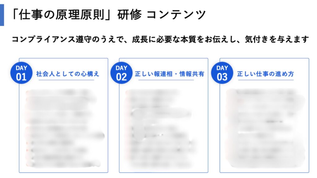 この3つの「仕事の原理原則」を徹底する、研修コンテンツをご用意しております。