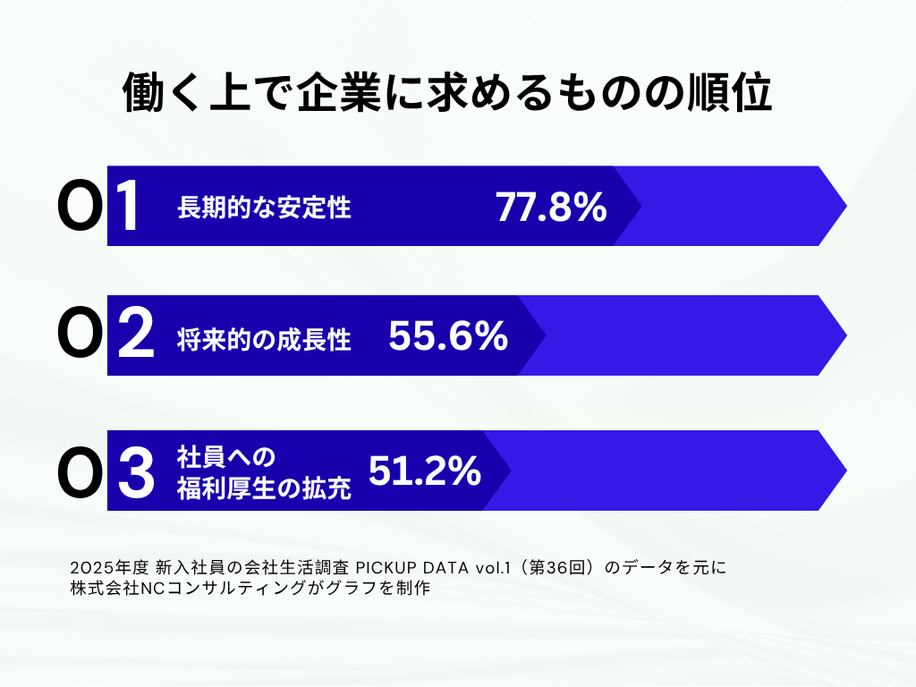 また、働く上で企業に求めるものの順位を見ても、1位が「長期的な安定性(77.8%)」、2位が「将来の成長性(55.6%)」、3位が「社員への福利厚生の拡充(51.2%)」となっており、高収入や競争を求める声は上位にはありません。